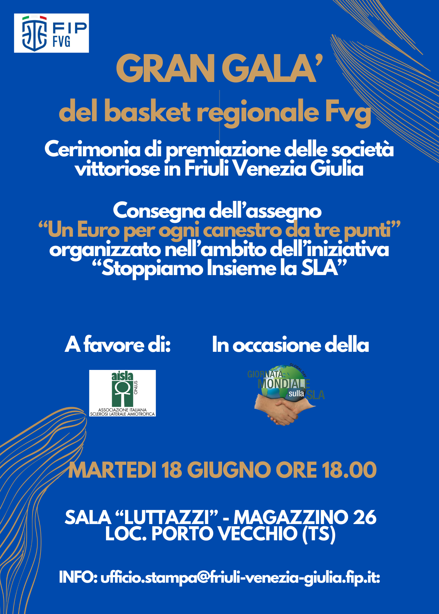 Si terrà martedì 18 giugno 2024, dalle ore 18.00 nella Sala Luttazzi del Magazzino 26 (Porto Vecchio – Trieste) il Gran Galà del Basket Fvg, cerimonia di premiazione di tutte le società, dalle giovanili alle categorie senior, che si sono aggiudicate i rispettivi titoli in Friuli Venezia Giulia.